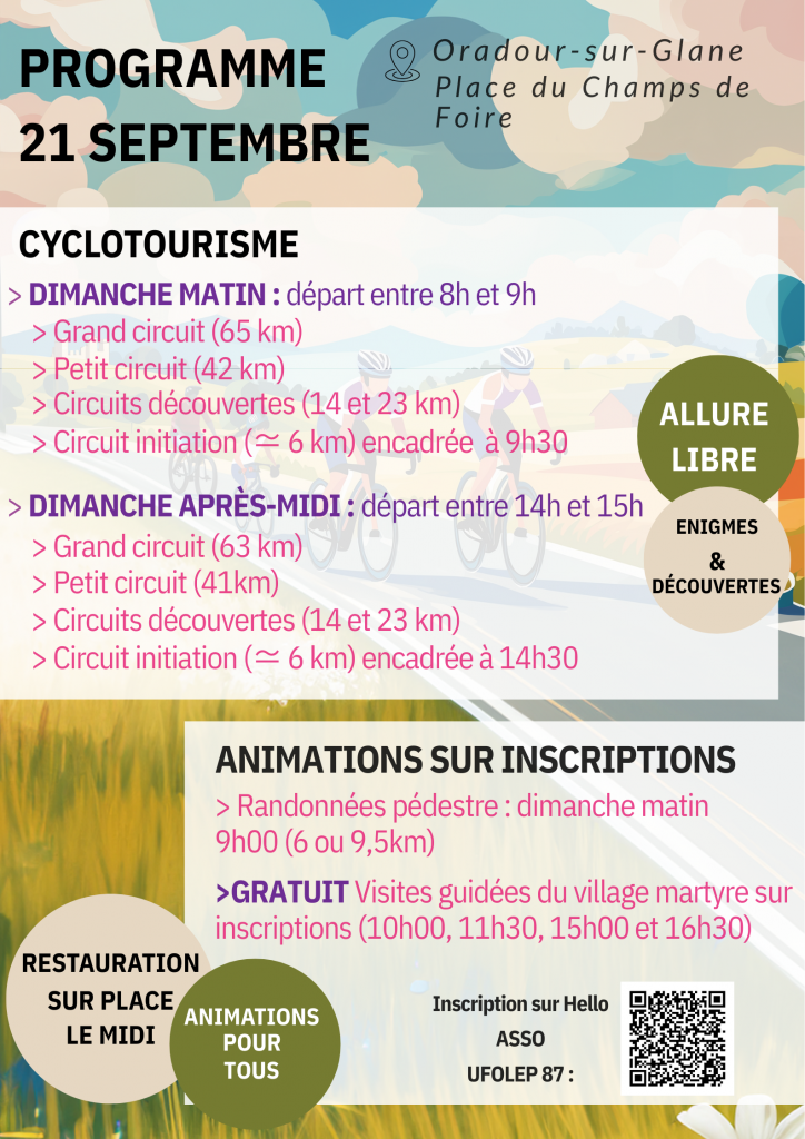 Le point de départ et d’animation principal sera situé Place du Champ de Foire, à Oradour-sur-Glane (87). Ce rendez-vous s’annonce comme un temps fort de la rentrée, mêlant sport, plaisir et rencontres